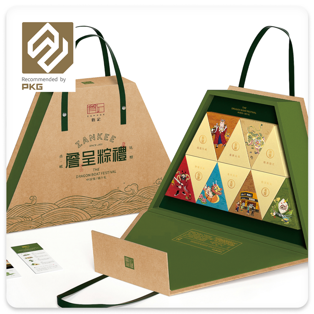 以充满自然古朴感的牛皮纸和竹纹作为主材料和主色彩运用,翠绿色作为配搭点缀,在同属性的礼品中,结合詹记国际品牌自身优势,对商品形象进行创新,突破市面上传统端午礼盒形象,同时深化詹记国际品牌形象。