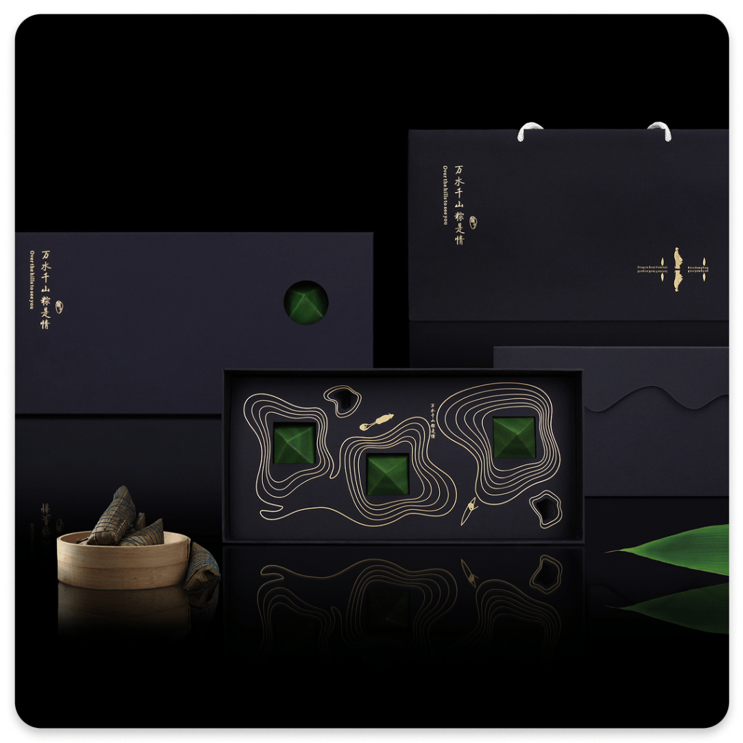 结构设计用了艺术环保纸尽可能的避免过度印刷带来的污染,用了最简单的工艺呈现了包装袋的效果。打开盒子是一幅烫金工艺的江南山水画,弯弯的梯田,耕田的人和牛,划行的小舟,画中镂空了3个洞,耸立起三座粽子形状的小山和山水画融为一体,里面装的是香袋送给客人。点选查阅完备事例汕头市 /服务项目:肉类 创意结构设计