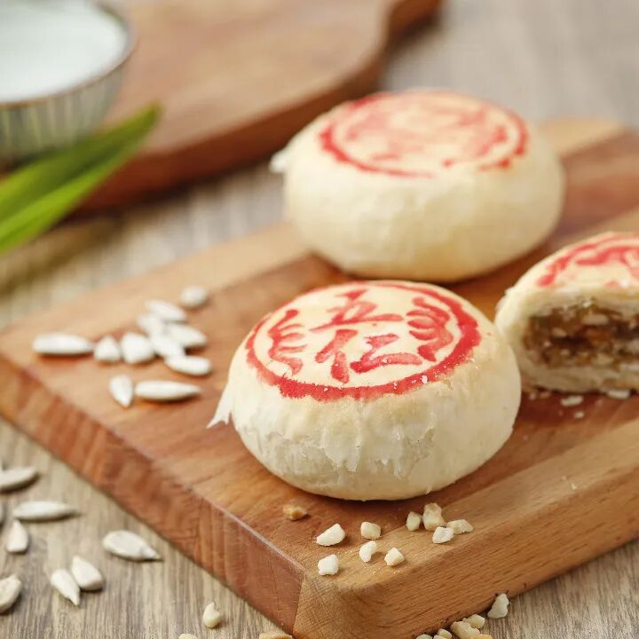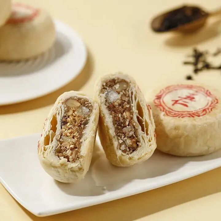 汪玉霞苏式五仁月饼,精选优质五仁(杏仁、核桃仁、葵花籽仁、芝麻仁和西瓜仁),烘烤后拌入沁人桂花、冬瓜糖及火腿丝,馅料的味道融在一起,口感变成绵密松软,不油不腻。