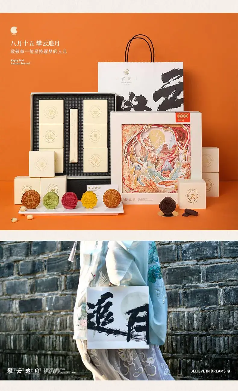 礼盒名为彩云追月,唐饼家中秋礼盒想要带给大家一种穿越时空,令人莞尔的意境。李白诗中写到“但见宵从海上来,宁知晓向云间没?”