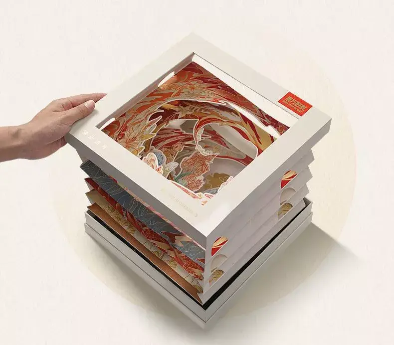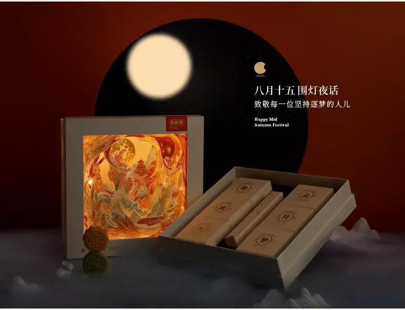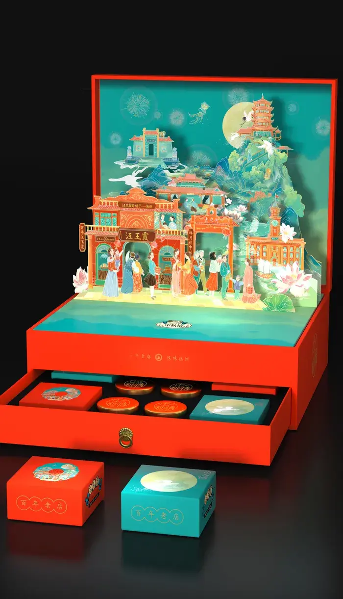 礼盒徐徐打开,上半部分一幅“清风彩云伴明月、中秋良辰映江城”的美景映入眼帘,采用三层立体层叠的工艺,更加生动而富于新颖。 礼盒的下半部借鉴传统“梳妆盒”的创意,分为上下两层,上层为翻盖、下层采用抽拉方式。内盒小包装则提取了玉兔和汪玉霞店铺作为视觉元素,与整个礼盒形成整体。