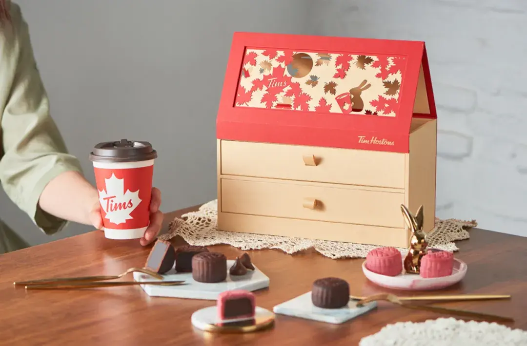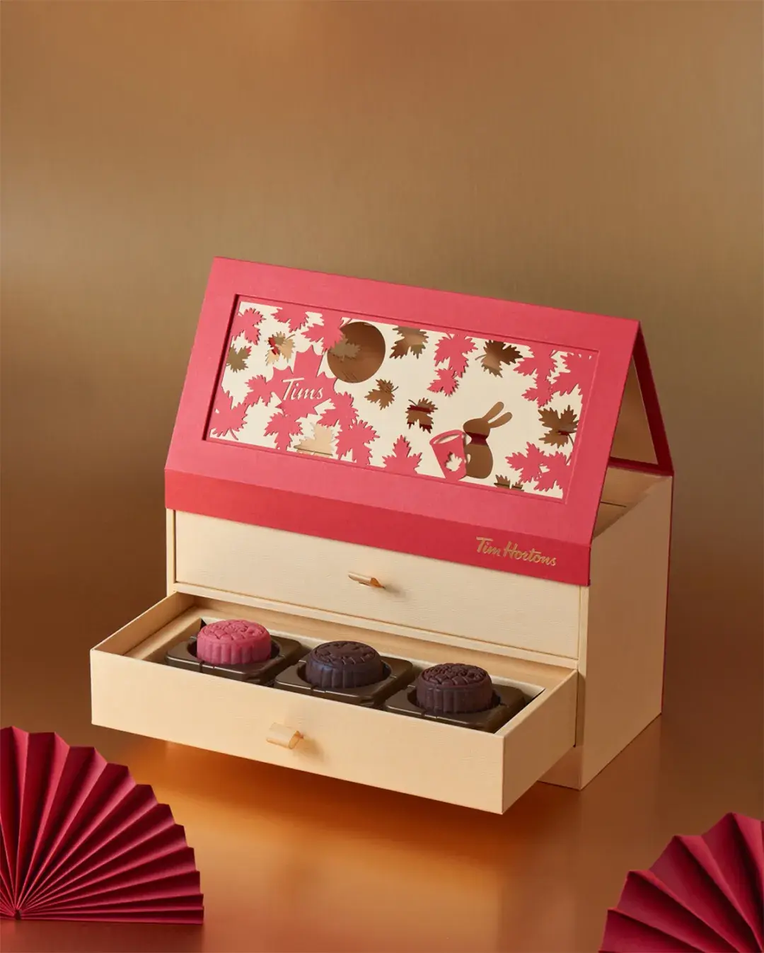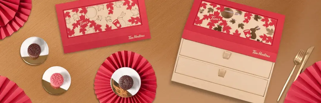 设计背景与理念:Tim Hortons诞生于1964年,是一家来自加拿大的暖食咖啡馆,被称为加拿大国宝级咖啡。自Tims入驻中国以来,一直在融入中国市场。这次的枫享月饼礼盒是Tim Hortons第一次生产制作中秋传统食物——月饼,并以礼盒形式进行售卖。枫享月饼礼盒旨在融入中国咖啡市场的同时并吸引更多的中国消费者关注品牌。整个礼盒描绘出的画面——枫树林中飘散着咖啡香气的小屋,表达了品牌创始人的初心⎾带给你家的感觉⏌。