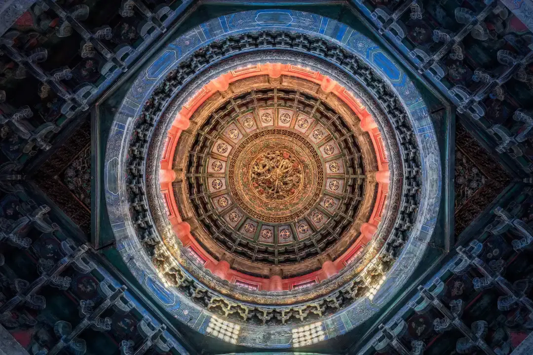 双层八角盒万春礼盒的盒面设计灵感来源于御花园万春亭藻井结构。三交六椀菱花纹饰,寓意天地之交而生万物;旋子彩画中的旋花图案做凤翅瓣式样,称作“喜相逢”,象征团圆完满之意;传统祥云纹饰,寓意祥瑞之气,表达了吉祥、喜庆、幸福的愿望。