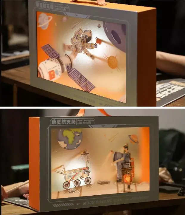 礼盒盒盖的插图是以月球探索为灵感,将科技未来与中国传统节日文化相互碰撞,也从侧面凸显了将科技与文化做连接的品牌特点。内部附带追光游戏面板,让消费者有互动感又增加了趣味性。当用礼盒内配备的红外线手电筒照射游戏面板时,可看到藏匿在黑色涂层下的画面——几只兔子与月亮的互动画面。追光游戏的画面以中国成语「月下读书」、「焚香拜月」为灵感,在突出中秋主题的同时又与品牌强调的文化感相融合。