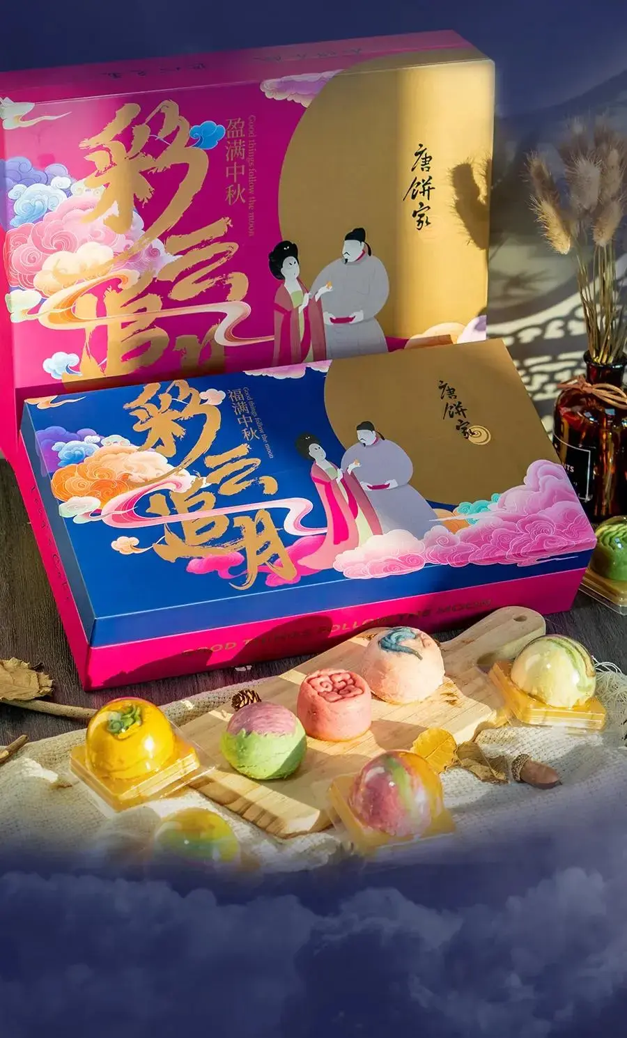 设计师将唐代绘画中各种云朵的绘画技法,与绚丽色彩相结合,融合水晶UV的工艺,呈现出立体的视觉效果。古代的云朵都有各自的姓名:卷云、层云、叠云,如同唐饼家百层起酥工艺制成的蛋黄酥,源于唐朝的工艺与彩云有了这般默契的配合,形成了独具特色的“月饼”形态。