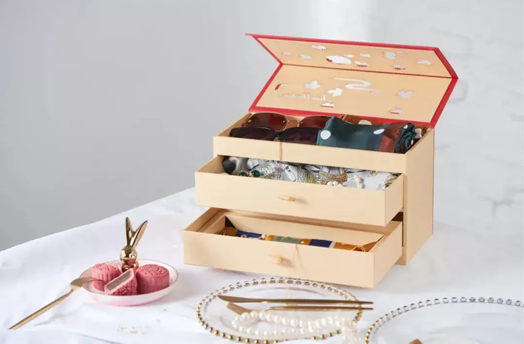 枫享月饼礼盒采用磁吸开盖双抽屉设计,开盖时盒盖可吸附在抽屉上方形成一个木屋。既不遮挡抽屉的开合,又凸显独特造型,精美实用又方便运输。盒盖上中国风的镂空画面在传递出品牌元素与概念的同时,让整个礼盒显得十分精致。长方形的礼盒造型为礼盒的二次利用提供了空间,为陈列首饰提供了有效空间。