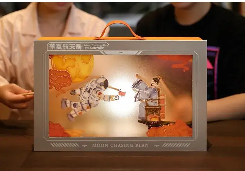 礼盒的材质用的镭射银卡,这种材质的特性就是从不同的角度去看会呈现炫目多彩的颜色,从材质上寓意了中国文化的丰富多彩。 在插画绘制表现上,设计师绘制了卡通的历史人物,神话人物,外星人,宇航员的乱入。集合成了丰富多彩的宇宙中秋全家福。