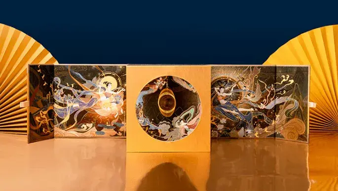 飞天仙女在包装内壁上栩栩如生,礼盒内包装为两层格档设计,使内壁图画更具立体感和深度,为观赏飞天壁画艺术带来全新感官体验。礼盒正中心可悬挂风铃,手机扫描礼盒内壁便能在虚实之间深切感受敦煌艺术的魅力。
