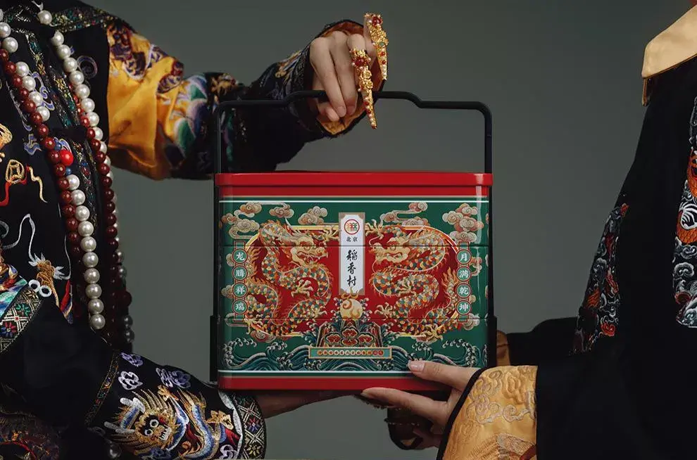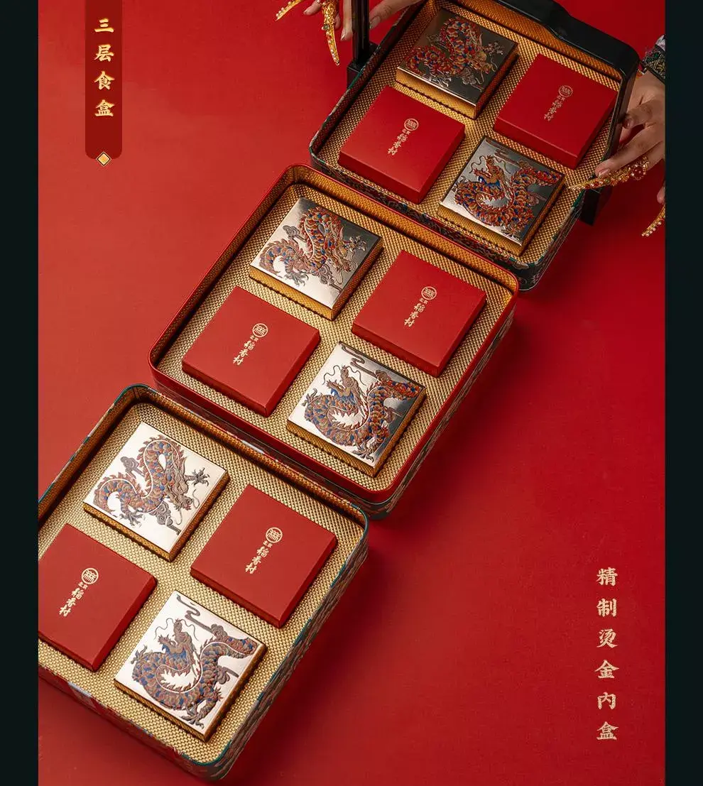 稻香村的此款三层金属大提盒,体量感十足,以二龙戏珠为主要视觉,像清宫剧走出的道具,端出来贵气袭人,诚意满满,还能勾起八零九零后儿时铁皮饼干桶的回忆。