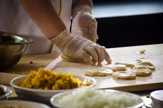 ④ 擀制包馅:将做好的皮和面分成一小坨,一小坨,再把酥面放到皮面里面,压平折叠,就成了一层一层的了,再把搭配好的馅料放进去,案板上的工作就完成了。