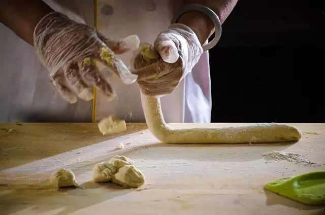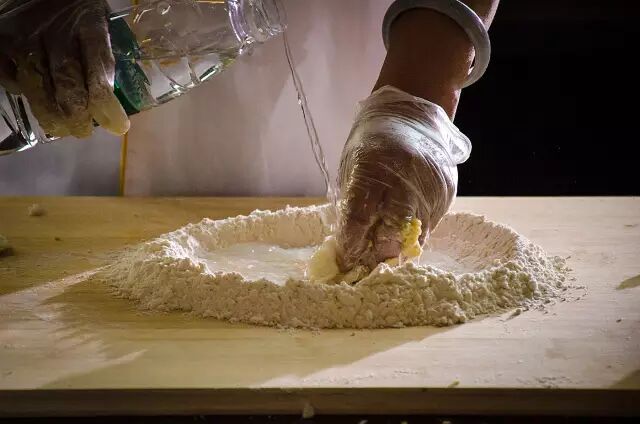 ② 制作皮料:猪油用热水调开,水温是冬季80度、夏季65度,调匀后,加入高精面粉,用手搓开,这时候的面是棕黄色,非常光滑有韧性;接下来用凉水浆面,倒入一点凉水,用手揉匀,再倒一遍,反复4次,面被揉成雪白色的时候,皮料就算制作好了。