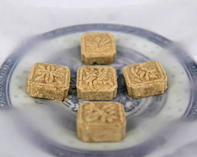 ① 配料榨油:做糕饼,不管做什么糕饼,首先要配料,提前一个小时来做这些工作,把料称好,搭配好。然后把猪板油切成丁,要求炸出的油冷却后是雪白的,不能有焦黄,所以火候很讲究,先是160度大火煮沸,再逐渐调小,细火熬制。